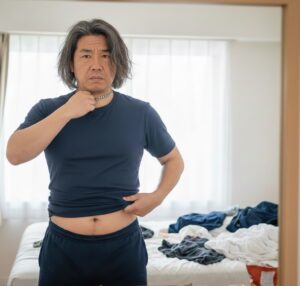 それがいつの頃からか、長年着ていたTシャツが「妙にきつい」と感じるようになった。「綿だから縮んだのだろう」と自己暗示をかけたが、やがてネックレスがチョーカーのように感じられ、腕時計の付け心地にも余裕がなくなってきた。